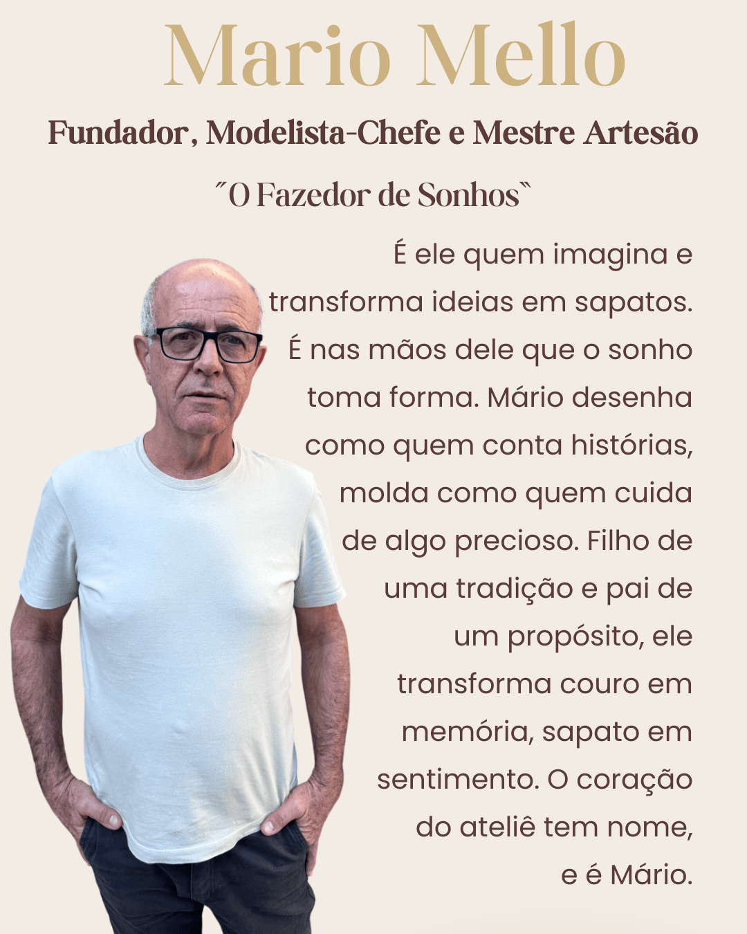Nossa história começa a ser escrita muito antes do nascimento do Ateliê. Com raízes familiares no setor calçadista, Mario Mello — fundador da marca — sempre esteve envolvido nesse universo, seja como modelista, profissão que exerce há mais de 35 anos, seja como empresário. Com o crescimento acelerado do e-commerce, especialmente no período pós-pandemia, Mario enxergou uma grande oportunidade de aplicar sua experiência na criação de calçados femininos de altíssima qualidade; foi assim que, em Julho de 2024, nasceu o Ateliê Mario Mello. Uma marca que carrega alma, história e propósito: oferecer conforto, elegância e autenticidade a cada passo.